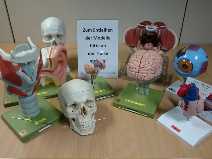 Unsere Körpermodellsammlung beinhaltet Schädel, Skelete, Gehirne, verschiedenste Organe und Körperteile für das Anatomiestudium. Nach der Ausleihe an der Theke können diese innerhalb des Lesesaals frei genutzt werden.