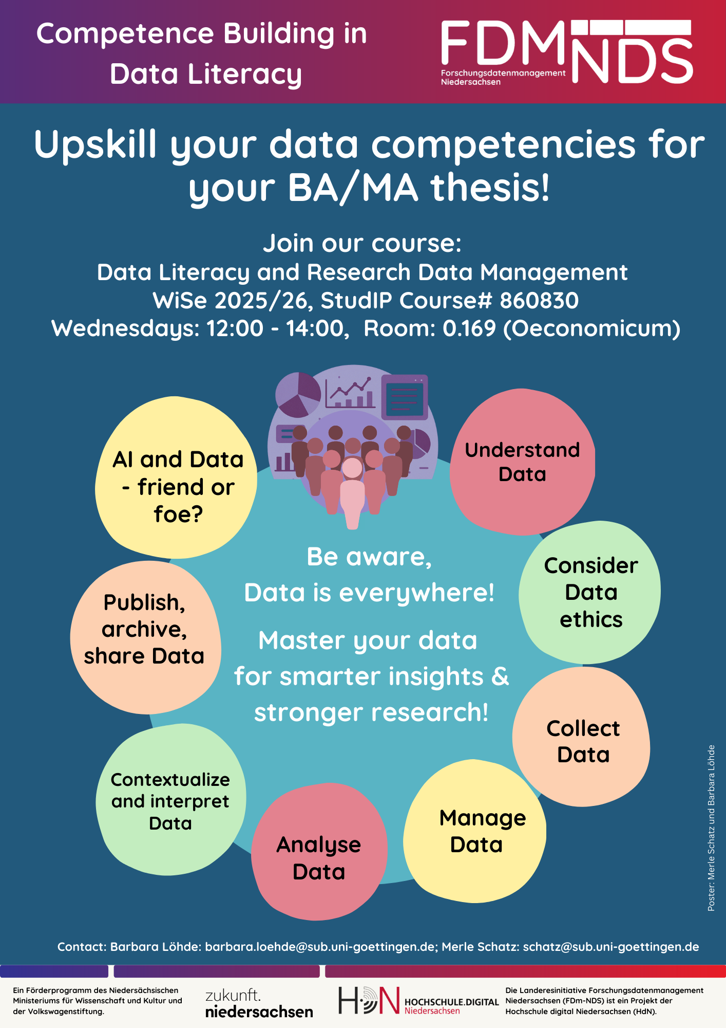 Ab dem Wintersemester 25/26 gibt es für BA/MA-Studierende der SoWi-Fakultät, die ihre Abschlussarbeit schreiben, einen Kurs zum Thema Data Literacy and Research Data Management: Upskill your data competencies for your thesis.